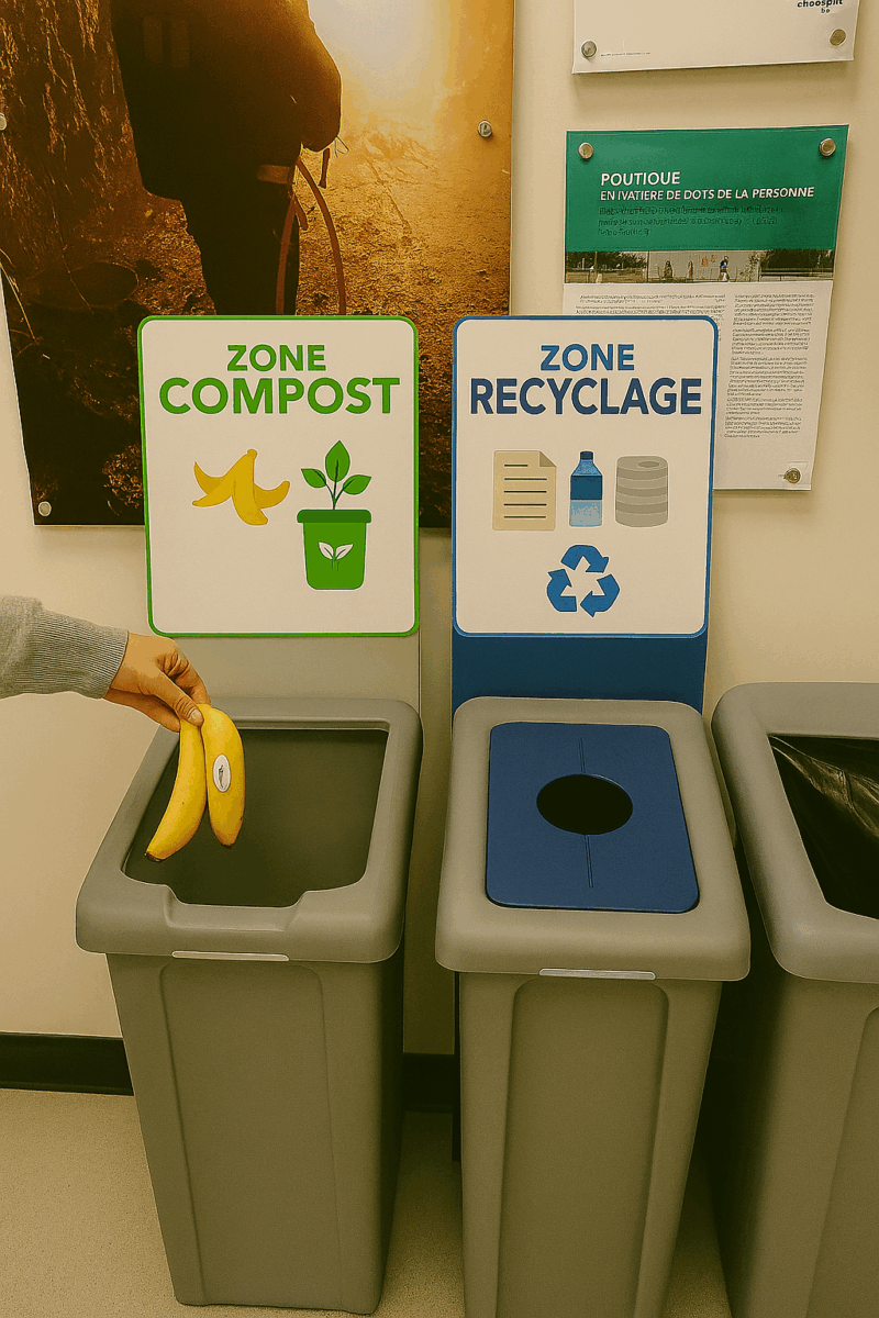 Chaque station comprend trois bacs distincts : déchets, recyclage et compost. De plus, des bacs de compost ont été installés dans toutes les salles de bain afin de recueillir le papier brun, qui est entièrement compostable.